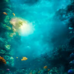 Movie poster, deep sea, Undersea, deep blue shading, low angle, divine atmosphere, global illumination, radiant light, hyper quality, elaborate, detailed and intricate environment, clean linework,