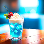 one Transparent blue soda on ice cream, (Transparent)1.3 sizzle, cherry on round ice cream, cafe, commercial photograph, hyper quality, elaborate, ultra detailed, Comforting atmosphere, soft lighting, beautiful composition, product shot