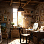 室内 小さな部屋 画材 画家 絵画 茶色 作業机 椅子 絵具 小屋 窓 ライト
