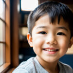 日本人 子供 男の子 男子 笑顔 黒髪 ポートレート クローズアップ オレンジ