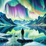 Beautiful aurora borealis spectacular view, reflective water surface, very wide shot, fantasy, natural light, light particles, RAW photo,