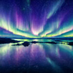 Beautiful aurora borealis spectacular view, reflective water surface, very wide shot, fantasy, natural light, light particles, RAW photo,