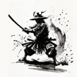 戦うサムライ、モノクロイラスト、墨絵、水彩イラスト、墨絵スケッチ、