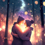 fire element, hugging, between realms in space cosmic entities, heart shape background, smiling, sunset forest