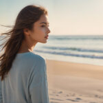 女性 女の子 10代 20代 夕日 朝日 夕方 海 砂浜 浜辺 水面 波打ち際 全身 自然言語プロンプト
