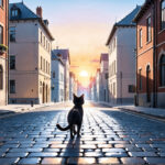 a cat walking on a cobblestone street t in a city at sunset or dawn with a building in the background, city background,