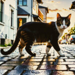 a cat walking on a cobblestone street t in a city at sunset or dawn with a building in the background, city background,