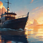 夕暮れ時のボートの絵。背景に雲、その後ろに沈む太陽、プロのデジタル絵画、絵画、映画のような照明、超高画質、超詳細