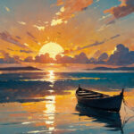 夕暮れ時のボートの絵。背景に雲、その後ろに沈む太陽、プロのデジタル絵画、絵画、映画のような照明、超高画質、超詳細
