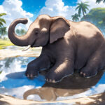 オアシスで楽しそうに水浴びをする巨象、サバンナのオアシス、水、水しぶき、木、草、空、穏やかな午後
