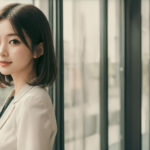 ビジネスシーン、30歳、美しい日本人女性、美女、(笑顔:0.7)、ビジネススーツ、自然光、
