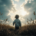子供 男の子 背中 バックショット 黒髪 逆光 草原 太陽 雲 光 夕方 朝日 FLUX.1