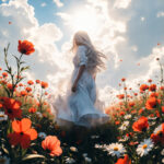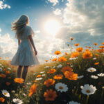 FLUX.1 赤 オレンジ 空 花 花畑 フラワー 咲く 満開 女性 女の子 少女 白髪 空 雲 逆光 光 太陽