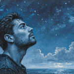 dark fantasy book cover paper art, a man looking up at the dark night sky, side view, water painting, intricate illustrations, delicate linework, fine details, enchanting scenes, dreamy visuals, captivating storytelling,