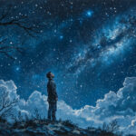 fairy-tale fantasy book cover paper art, a girl looking up at the dark night sky, side view, water painting, intricate illustrations, delicate linework, fine details, enchanting scenes, dreamy visuals, captivating storytelling,