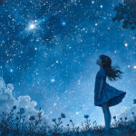 fairy-tale fantasy book cover paper art, a girl looking up at the dark night sky, side view, water painting, intricate illustrations, delicate linework, fine details, enchanting scenes, dreamy visuals, captivating storytelling,