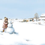 inter scenery of the Finnish countryside, silver world with snow on the ground, blue sky, A girl in heavy clothing is building a snowman,