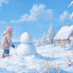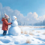 inter scenery of the Finnish countryside, silver world with snow on the ground, blue sky, A girl in heavy clothing is building a snowman,