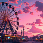 A Ferris wheel and clouds at dusk against a pink sky, street light, amusement park, rim lights, movie still, cinematic lighting, beautiful panoramic imagery,