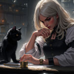 長い白髭を生やした錬金術師の老人の研究室、背景の本棚、テーブルの上のロウソク、フラスコ、実験器具、奇妙で暗い雰囲気、高解像度、超高画質