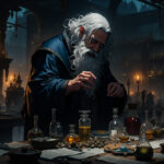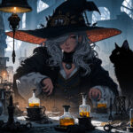 美しい女性錬金術師の研究室、助手の黒猫がこちらを見ている、背景の本棚、ロウソク、フラスコ、テーブルの上の実験道具、奇妙な、暗い雰囲気、高解像度、高画質