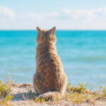 猫 ネコ ねこ キャット 野良猫 ペット かわいい 海 海岸 浜辺 空 波 波打ち際 雑草 キラキラ 反射 FLUX.1