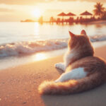 scene of a cat sitting by the seaside at noon in summer, viewed from behind, relaxing amidst a calm and peaceful atmosphere, vibrant detail, scene from movie, Cinematic Lighting,