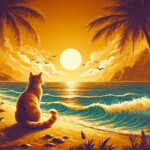 夏の昼、海辺の町で座っている猫を後ろから見たアニメ風のイラスト、