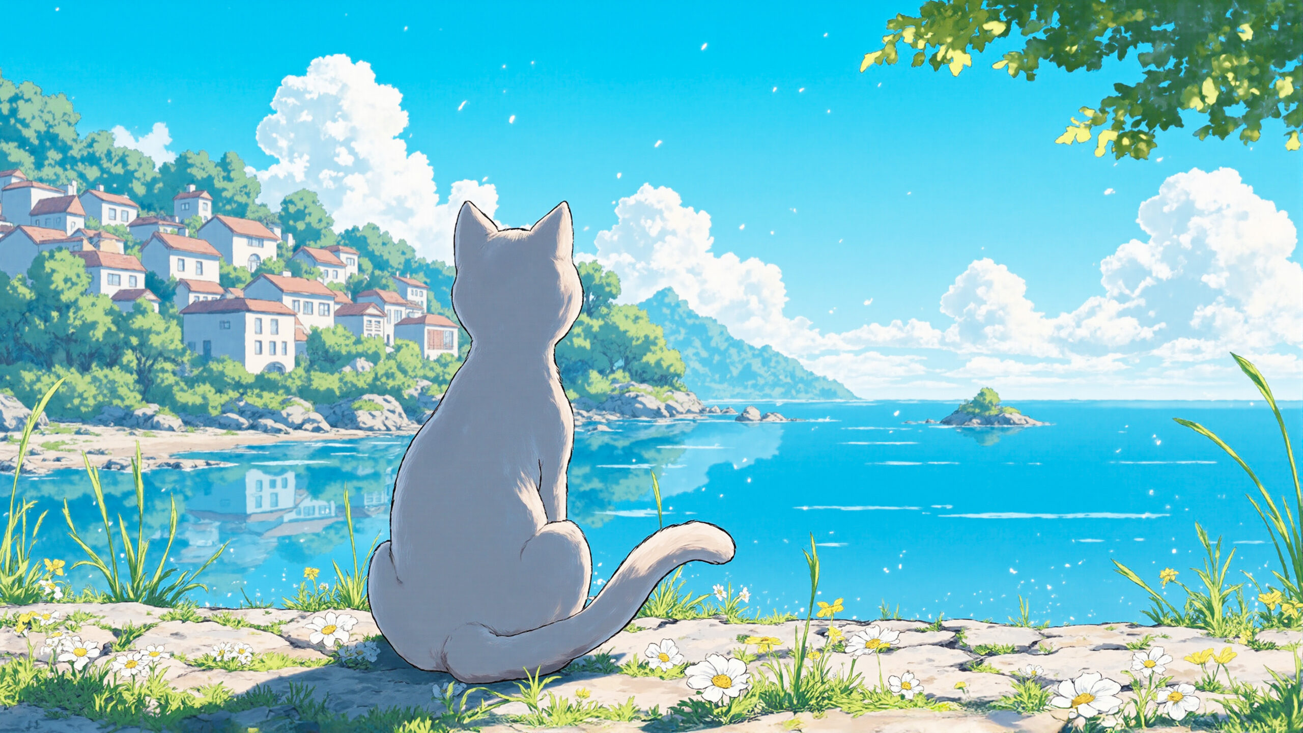 anime style illustration of a cat sitting by the seaside town at noon in summer, viewed from behind,