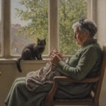 a painting of a old woman knitting in a chair next to a cat and a window with a cat sitting on the window sill, intricate oil painting, an oil painting, figurative art