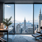 Beautiful cozy narrow study with floor to ceiling glass windows overlooking the city, view from the top of a skyscraper, beautiful sunset sky, maximalist, bookshelf, detailed photos, high resolution, photorealistic,