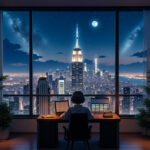 床から天井までのガラス窓から街を見下ろす、美しい居心地の良い狭い書斎、高層ビルの最上階からの眺め、美しい夕焼け空、マキシマリスト、本棚、詳細な写真、高解像度、写実的、