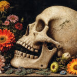 ヴァニタス、メメント・モリ、色あせた西洋絵画、美しい花々、色とりどりの草花に浸食された人骨、風化、虚無、死と腐敗、退廃的なアート、高解像度、傑作、超細密、緻密なディテール