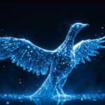 鳥 とり バード 飛ぶ 羽ばたく 光 輝き 発光 暗い デジタルアート 光の粒 キラキラ 黒 青 白