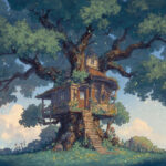 木の家 オークの木 樹木 巨木 緑 茶色 空 家 キラキラ Geminiでプロンプト作成