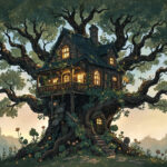木の家 オークの木 樹木 巨木 緑 茶色 空 家 キラキラ Geminiでプロンプト作成