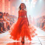 ファッションショーのランウェイを歩く優しい笑顔の女の子、彼女にスポットライト、美しいフリルのロングドレス、歩くモデル、光って踊る紙吹雪、明るく照らされた部屋、ステージライト、たくさんの光の粒、ぼやけたボール、都会的で洗練された雰囲気、