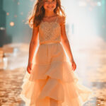 観客のいないファッションショーのランウェイを歩く少女、美しい花のロングドレス、歩くモデル、光って踊る紙吹雪、スポットライト、ステージライト、たくさんの光の粒、ボールのぼかし、都会的で洗練された雰囲気、
