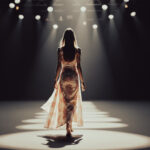 観客のいないファッションショーのランウェイを歩く少女、美しい花のロングドレス、歩くモデル、光って踊る紙吹雪、スポットライト、ステージライト、たくさんの光の粒、ボールのぼかし、都会的で洗練された雰囲気、