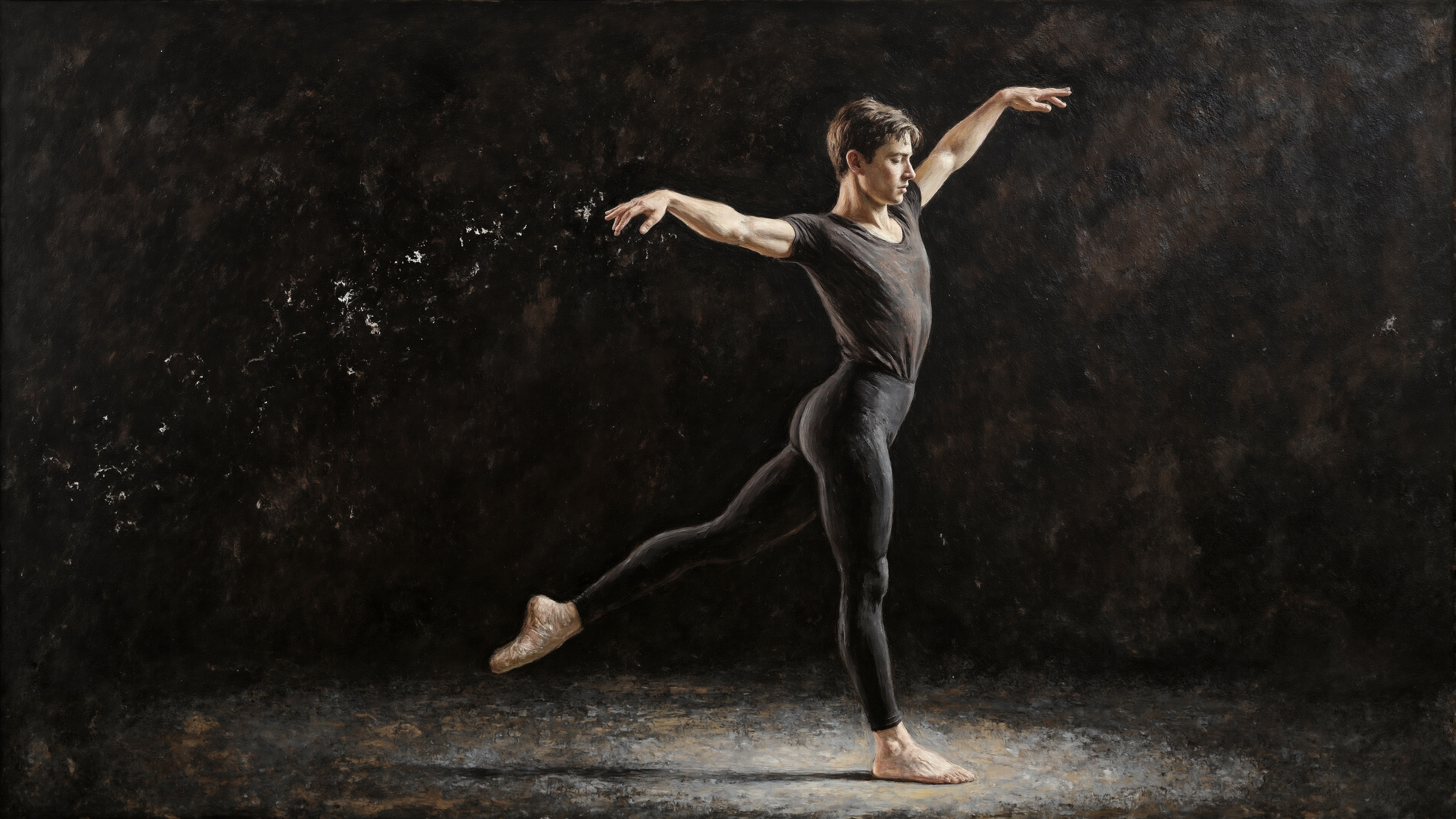 男性バレエダンサーの全身肖像油絵。印象派の巨匠によるかのような筆致で描かれ、筆触が鋭く浮かび上がる。きらめく光がダンサーの姿を際立たせ、背景は深く暗い。感情を込めた筆遣い。古典バレエの優雅さと力強さ。美術館に飾るにふさわしい傑作。黒のスキニーパンツ、黒のTシャツ。