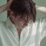女性 女の子 女子 黒髪 ヘアセット 髪型 ポニーテール 朝のワンシーン お出かけ前 白シャツ 部屋