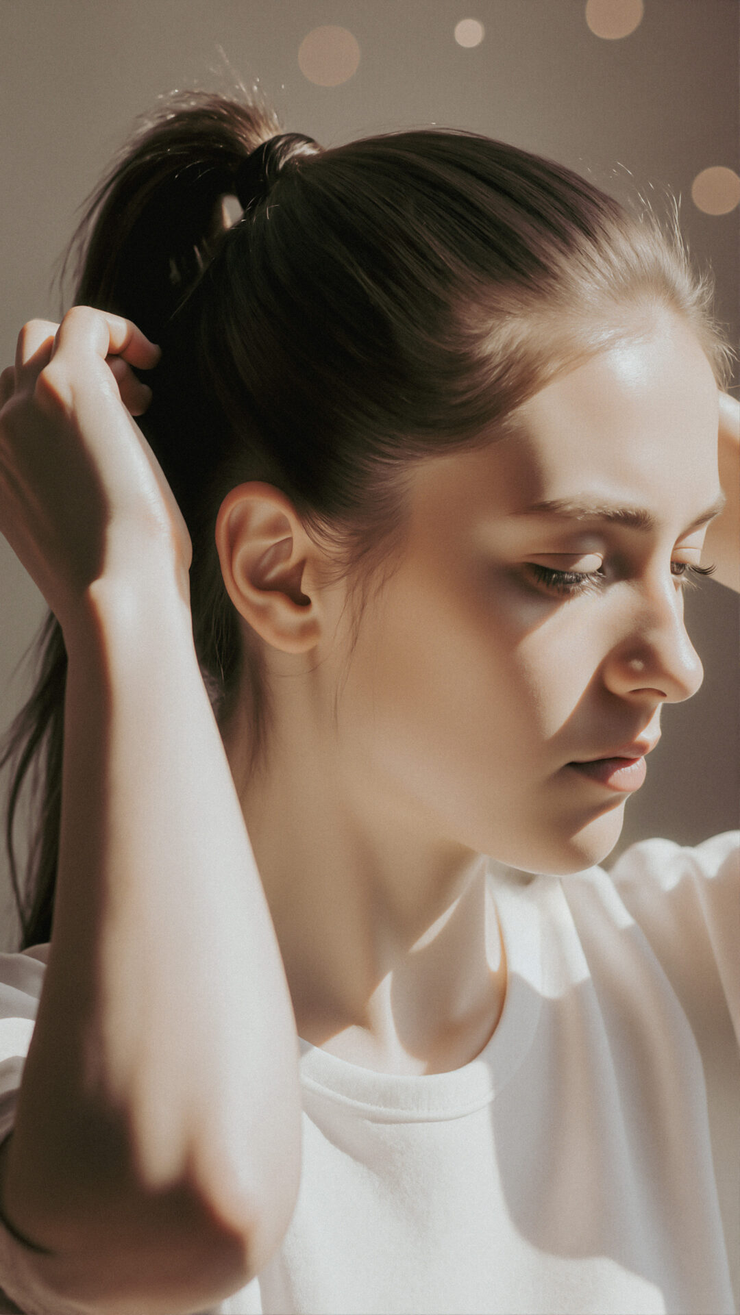 Photorealistic portrait of a young woman in the process of tying her hair into a ponytail, side profile. Both hands are gathering her hair at the back of her head. She has a slightly melancholic or pensive expression, with her eyes cast down. Shot in bright natural light. Realistic texture, high detail, bokeh.