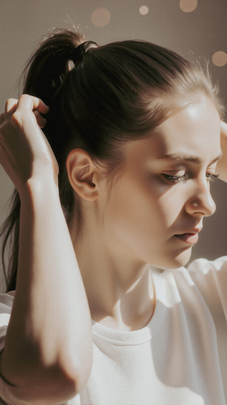 髪をポニーテールにしている若い女性の横顔。両手で後頭部の髪をまとめている。少し憂鬱そうな、あるいは物思いにふけるような表情で、目は下を向いている。明るい自然光で撮影。リアルな質感、高いディテール、ボケ。