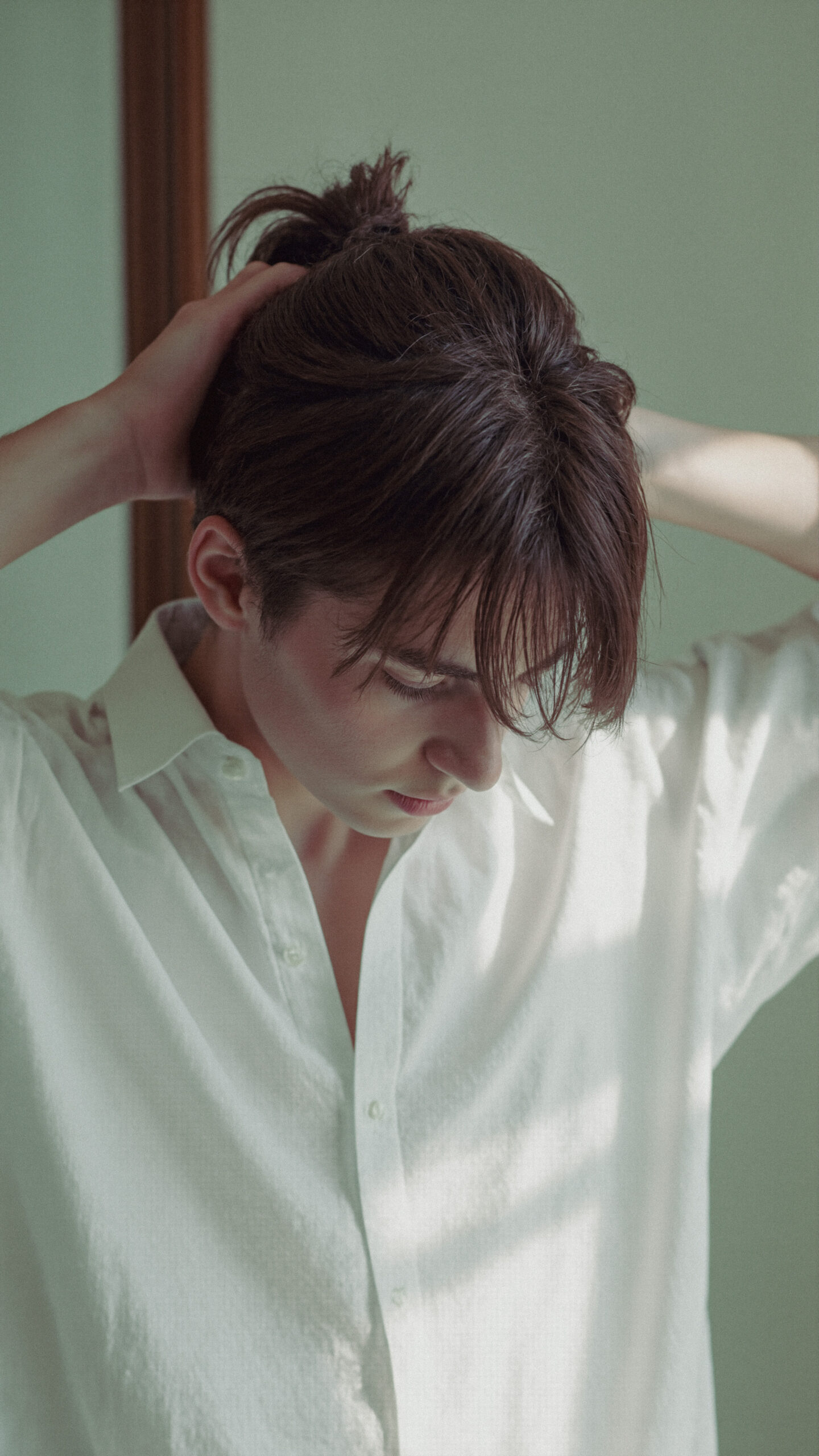 映画のワンシーン、髪をハーフアップに束ねた青年、首の下まで伸ばしたストレートヘア、白いシャツ、両手を頭の後ろで、伏し目がちな全身、横顔、朝日が差し込む部屋、美しい影、気だるい雰囲気。