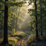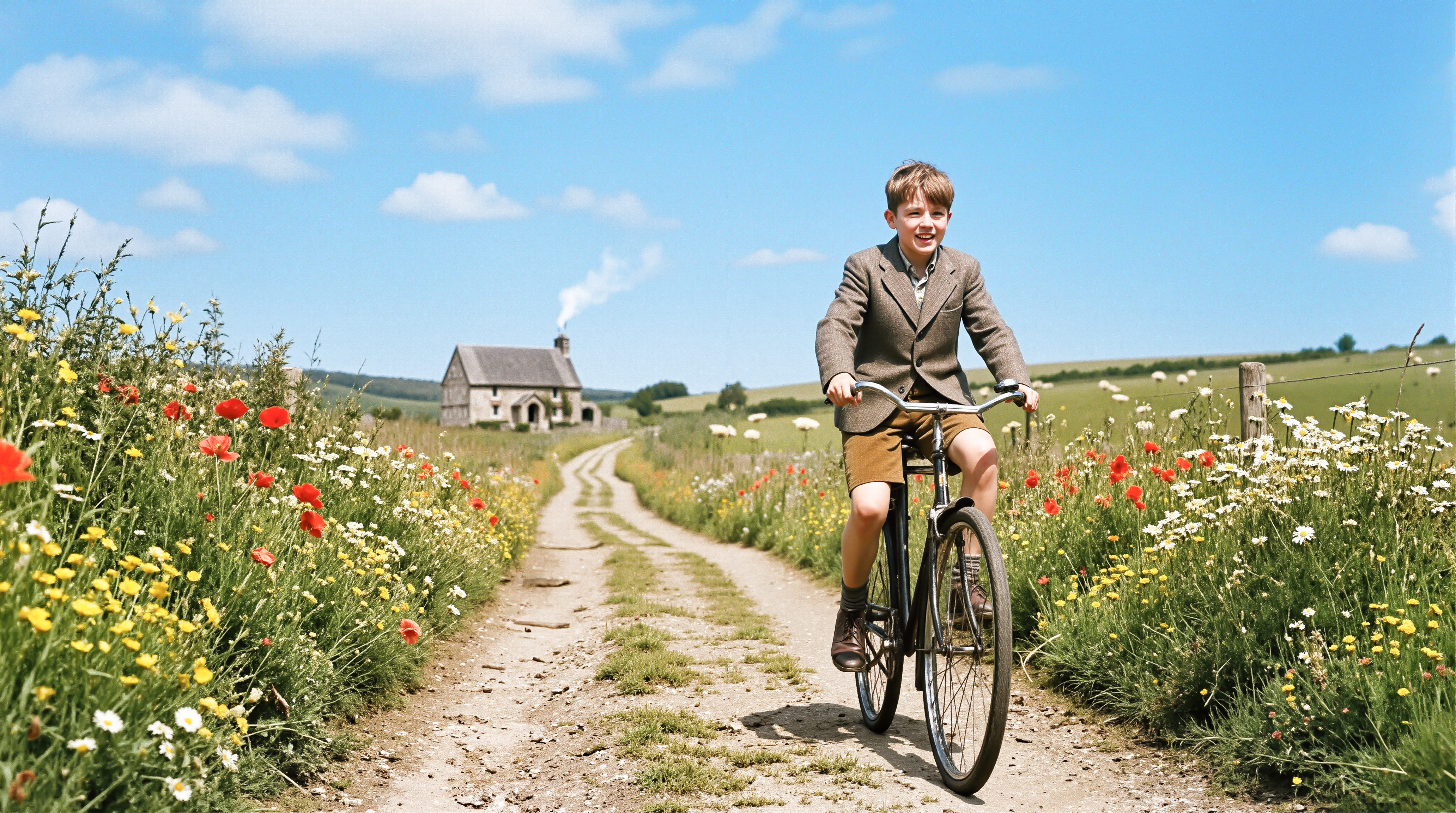 A boy cycling, seen from behind, a dirt road in the English countryside, small white wildflowers blooming here and there, a small cottage in the distance, a clear blue sky.