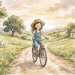 自転車を漕ぐ少年のバックショット、イギリスの農村の舗装されていない道、所々に小さな白い野花が咲く道、遠くに小さな小屋、青く澄んだ空、