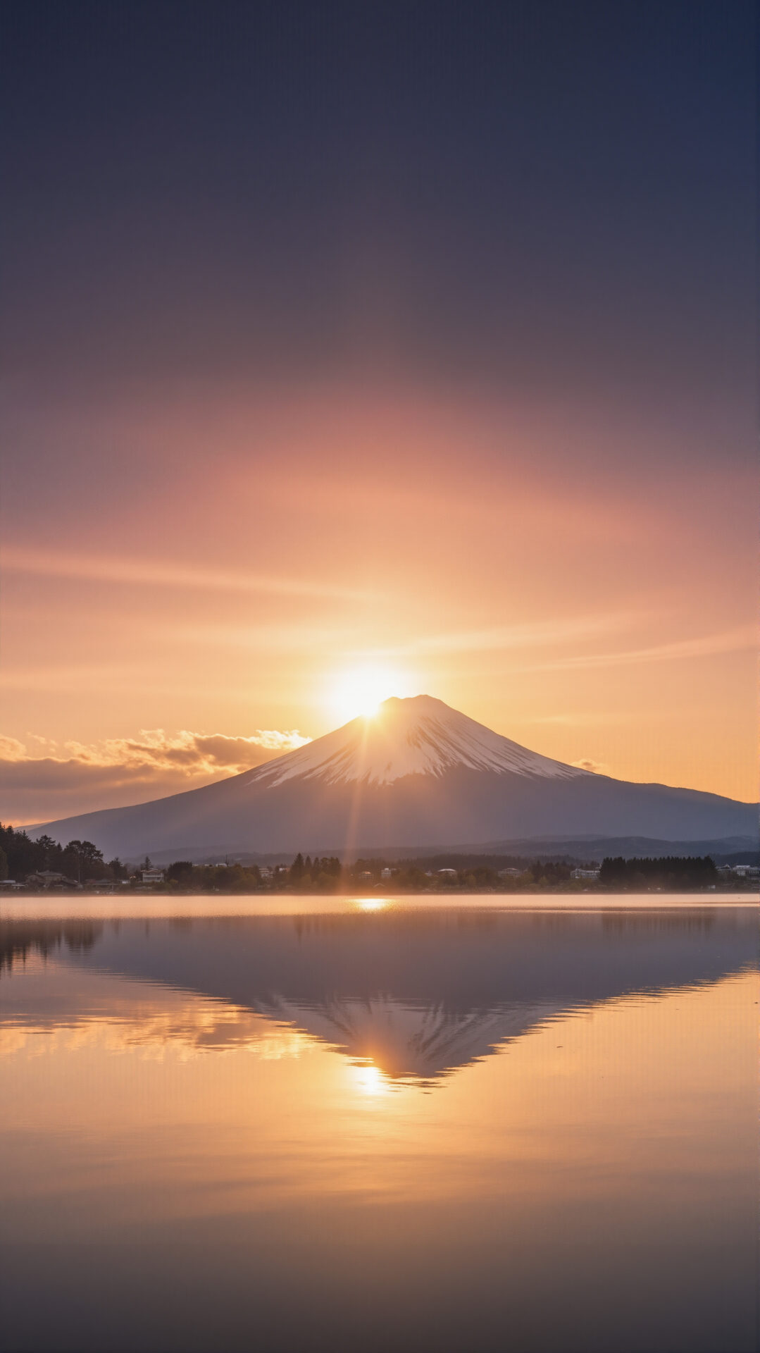 日の出 初日の出 逆光 太陽 富士山 お正月 年賀状 朝日 水面に映る山 反射 湖 空 雲 グラデージョン オレンジ 紫 紺 ピンク Gemini