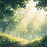 森 森林 山 山奥 道 木 樹木 けもの道 登山道 広葉樹 木漏れ日 緑 イラスト 手書き風 自然 背景
