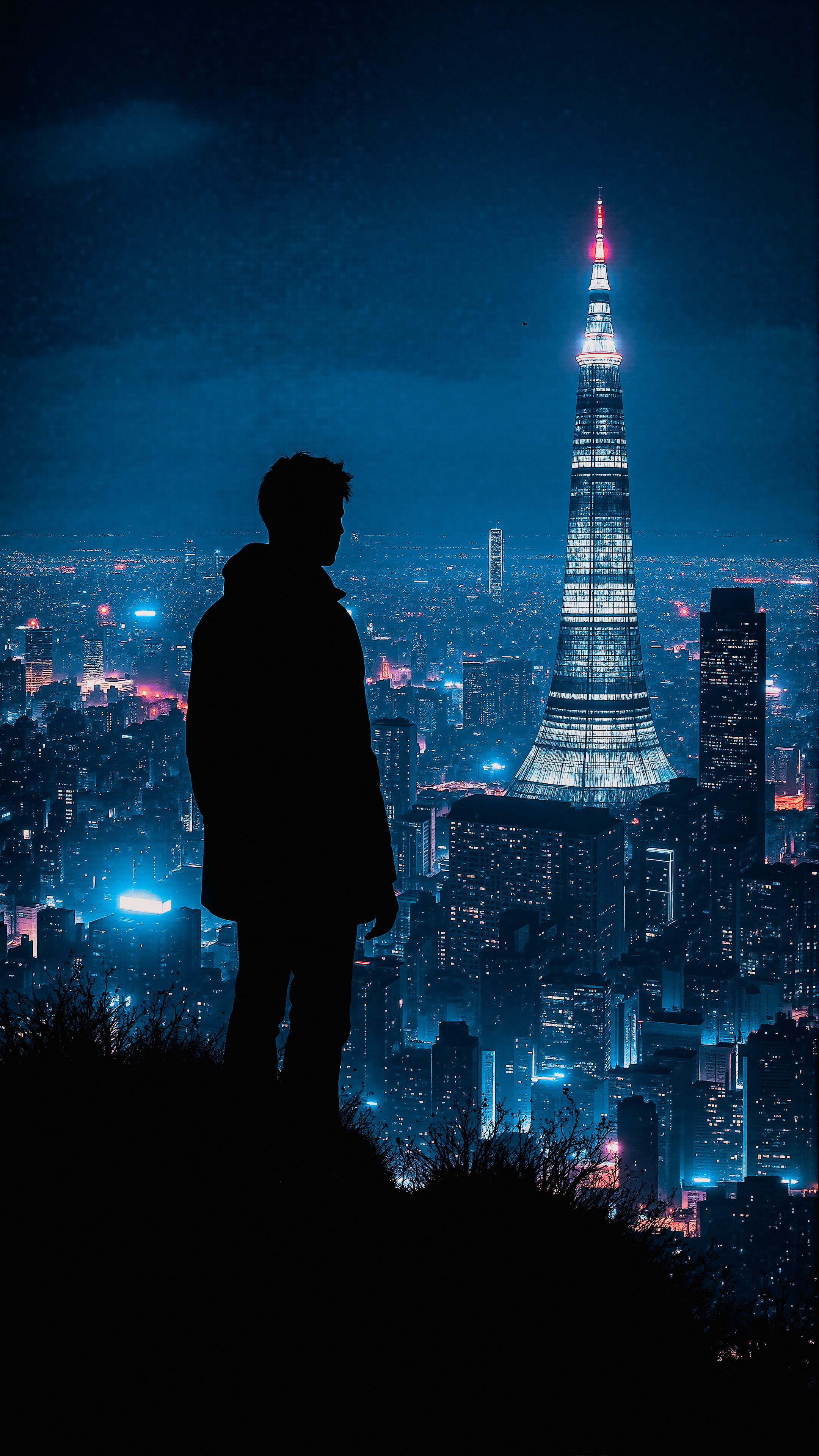 Tokyo nightscape, full-body silhouette of a man overlooking the city, side shot, photorealistic, lighting and shadow effects, city lights at night, ultra-detailed cityscape, extremely detailed, photorealistic, metropolitan, night view, captivating design