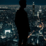 夜の街 高台 見下ろす 男性 シルエット 影 光 明かり 暗い 曇り空 ビル タワー 黒 青